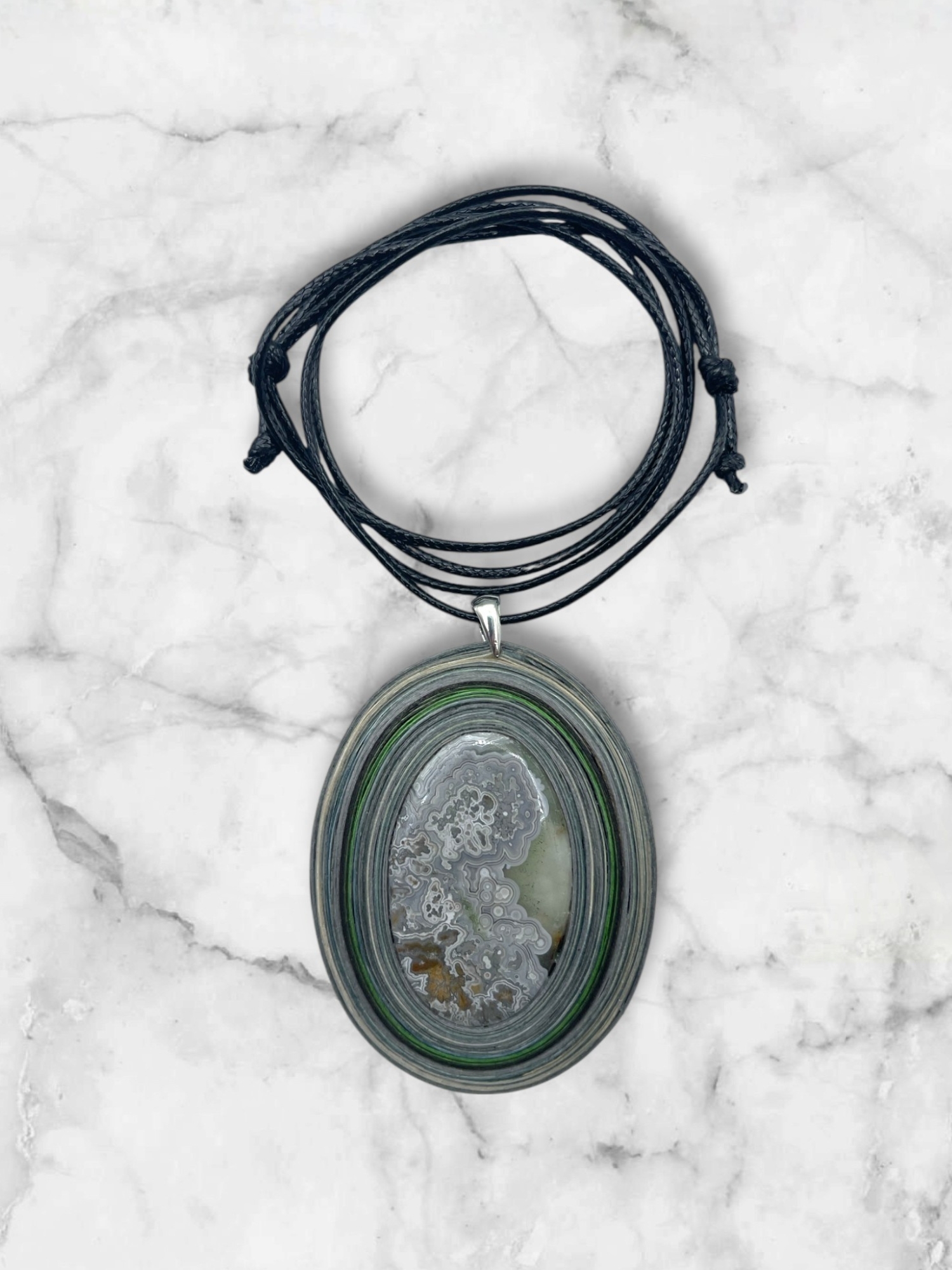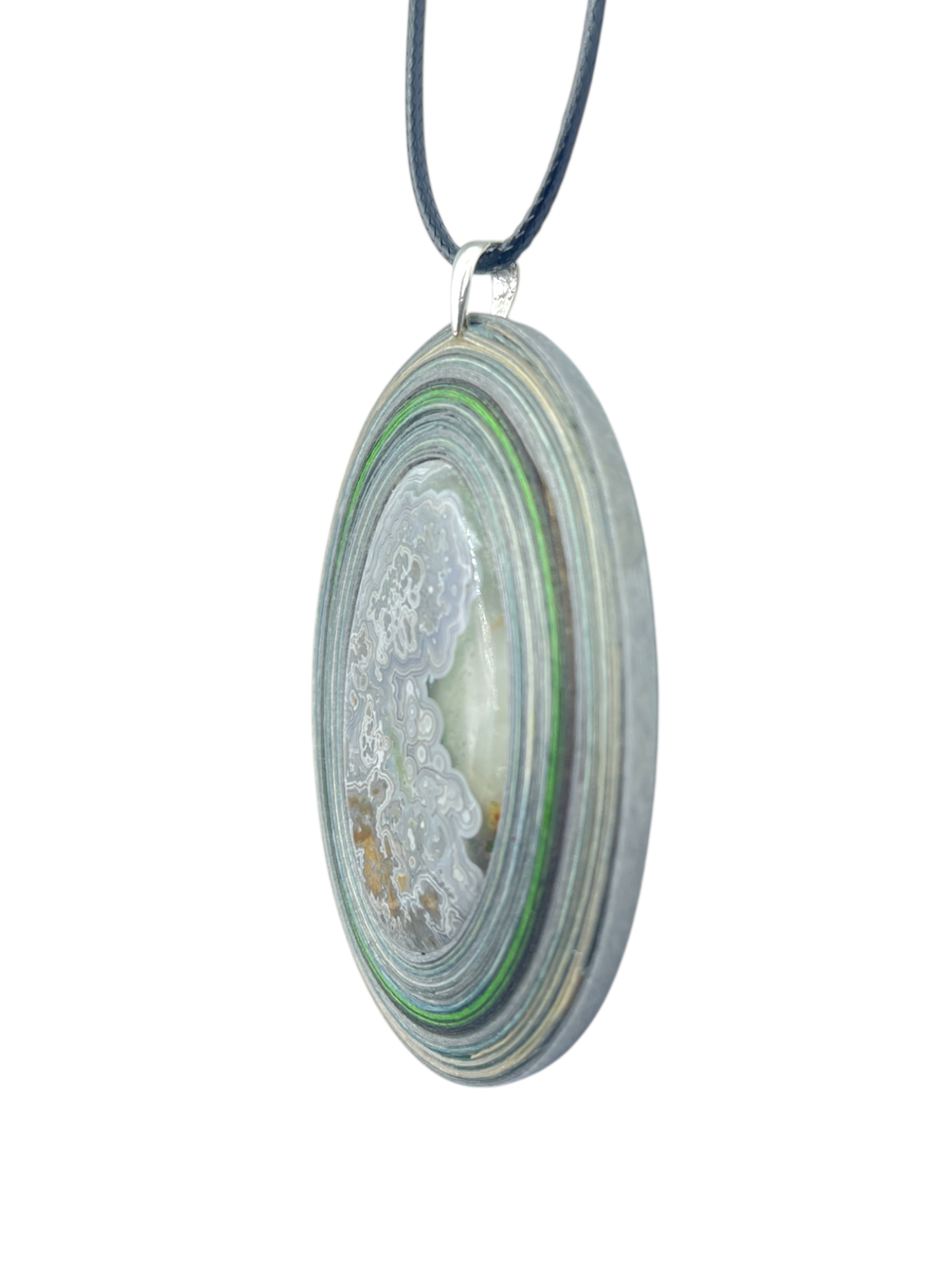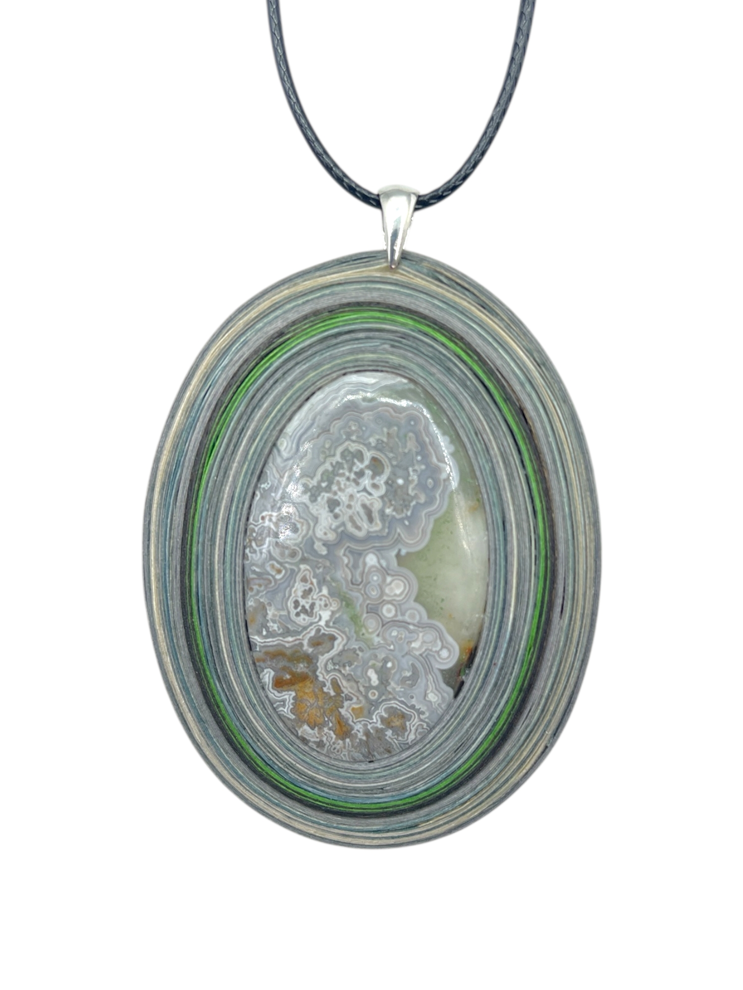 Wykonany z najwyższej jakości drewna osiki, ozdobiony agatem koronkowym.